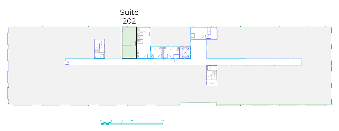 Private windowed office and reception. Expandable to a larger suite by combining with suite 202.